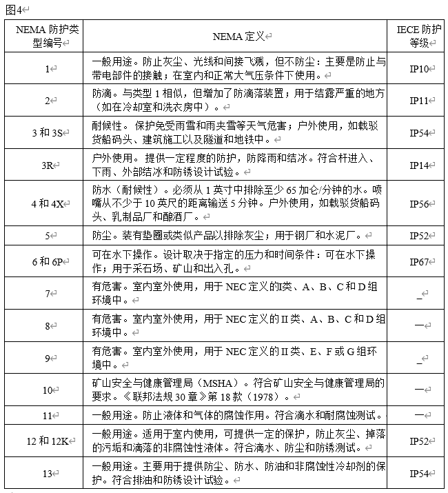 美国国家电气制造商协会(NEMA)和国际电工委员会(IEC)这两个标准小组为诸如线缆组件、外壳等产品设计了评级系统,定义了产品对灰尘、水分、水浸和冰的抵抗力。国际电工委员会(IEC)的等级被称为IP或异物防护等级。下表概述了美国国家电气制造商协会(NEMA)和国际电工委员会(IEC)的 IP防护等级。参见图4。