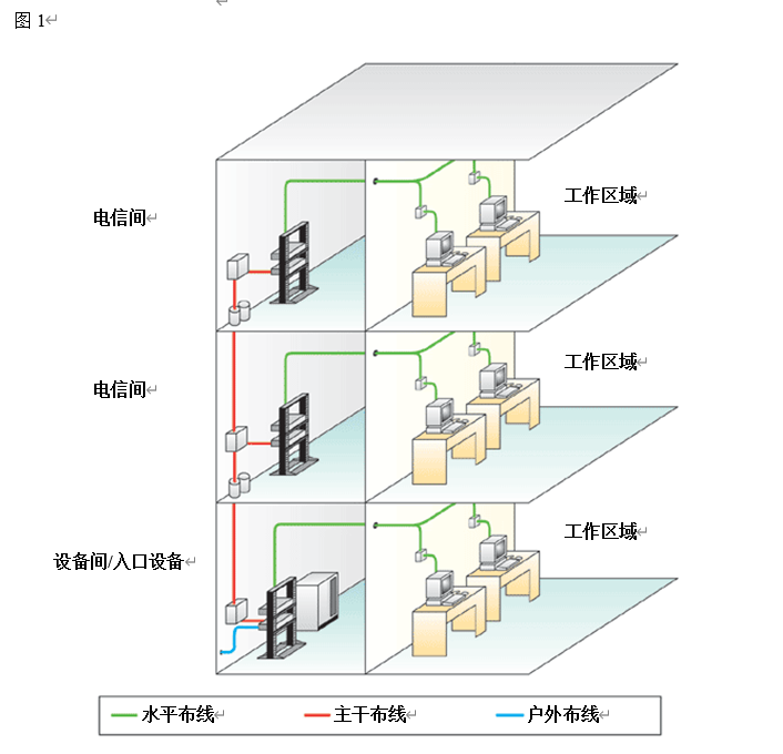 在这些类型的安装中,通常使用铜制非屏蔽双绞线(UTP)和光缆布线的组合。光缆布线可用于建筑物楼层之间的长距离传输,有时还可用于地下管道或直接埋线,从而连接多个校园建筑物。参见图1。