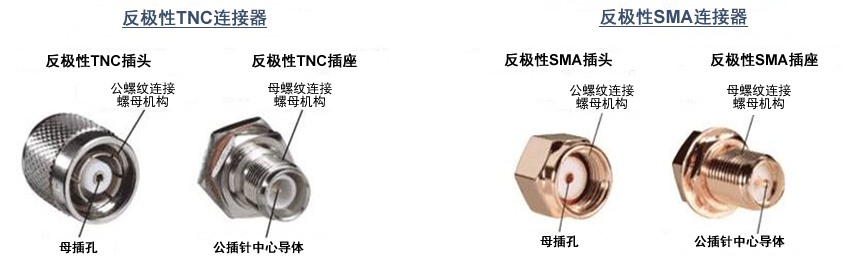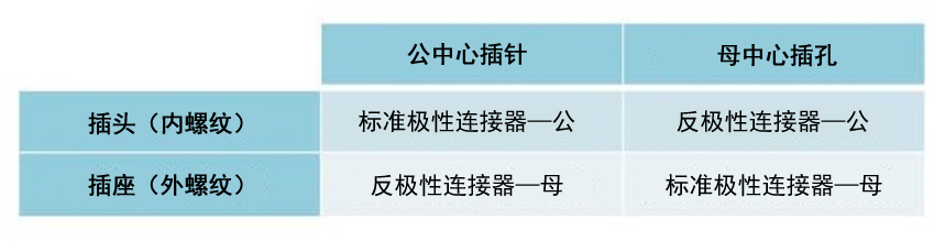 反极性连接器与标准极性连接器的外壳(插座或插头螺纹)完全相同,区别在于反极性连接器的中心插针设置方式正好相反。也就是说,反极性插座以公插针代替标准极性连接器的母插孔,而反极性插头以中心母插孔代替标准极性连接器的公插针。