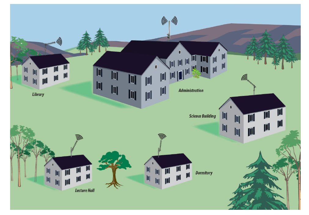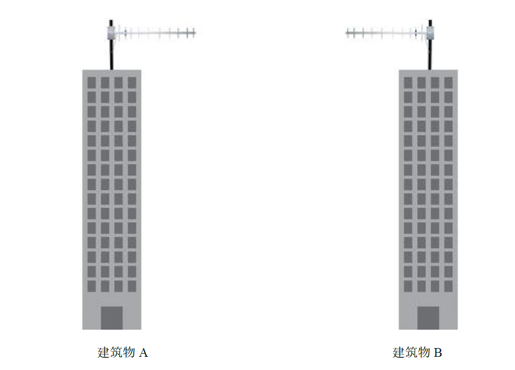 在这一设计方案中,您需要用到定向天线,例如八木天线或栅格抛物面天线。这被称为点对点无线链路。每栋建筑物都应当配备定向天线,并且天线必须向内相互指向对方。同时还要确保两个天线之间没有障碍物,例如树木或建筑物。清晰的视线关系至关重要。