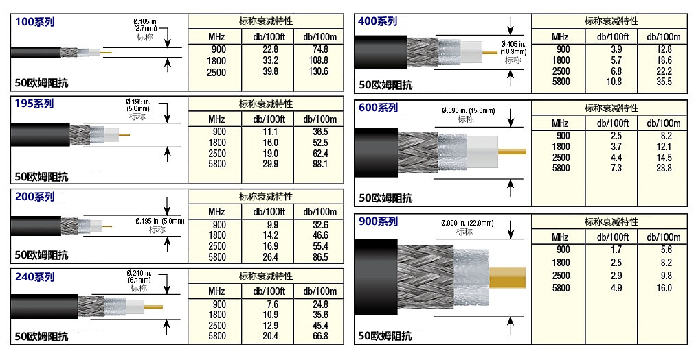 以下为常用低损耗同轴线缆的比较图表: